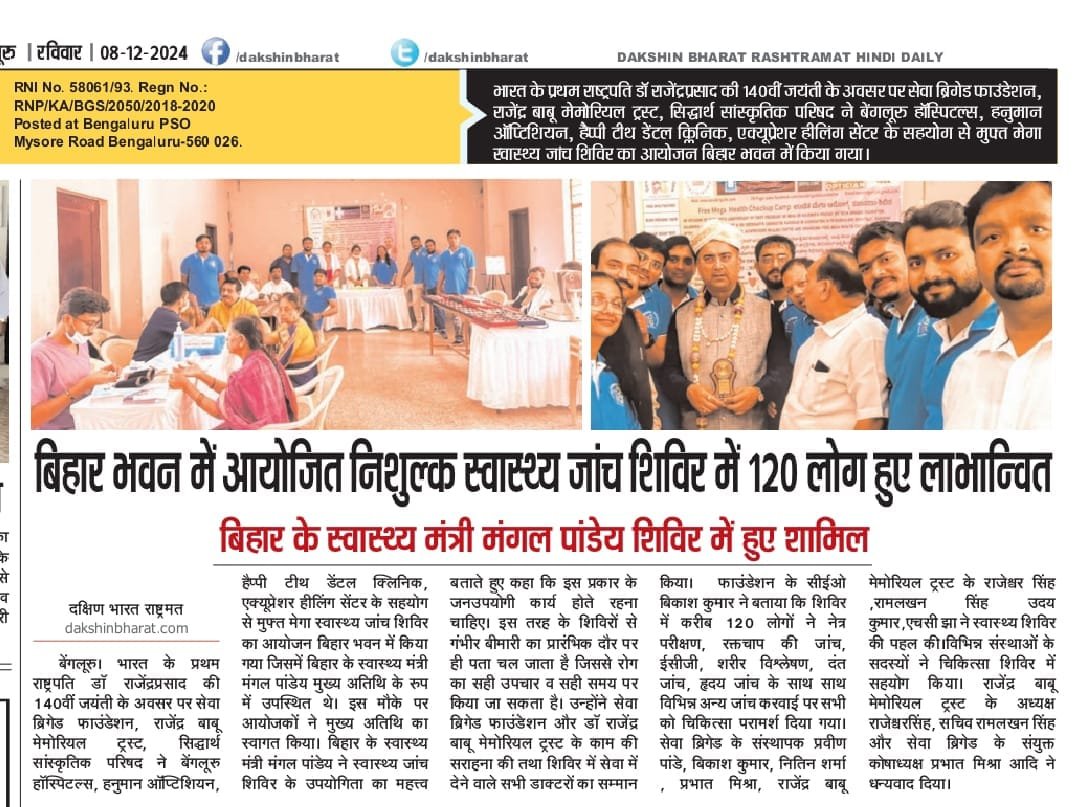 On occasion of 140th Birth anniversary of FIRST PRESIDENT OF India DR RAJENDRA PRASAD. we Seva Brigade Foundation , Rajendra BAbu memorial trust & Sri Sidddharth Sanskritik Parishad in association with Bangalore Hospitals , Hanuman Optician, Happy Teeth Dental Clinic, Acupressure Healing Centre had organized free mega Health checkup Camp day one